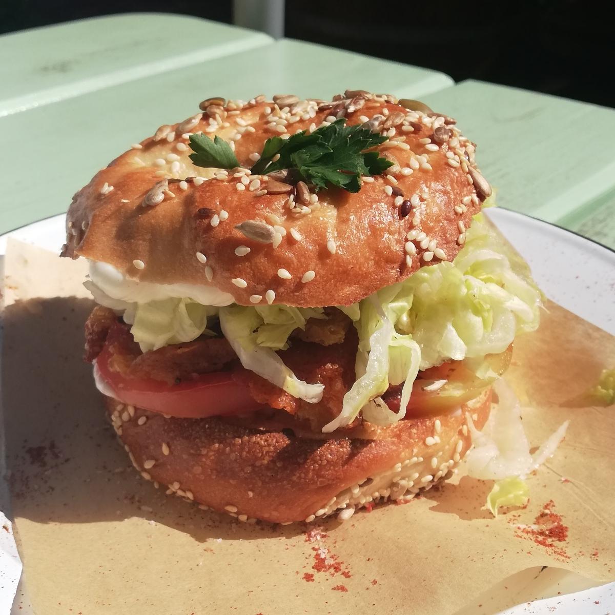 Crispy 'bacon' with fresh lettuce and tomato on a toasted bagel with the most delicious mayo. Crunchy and yum!