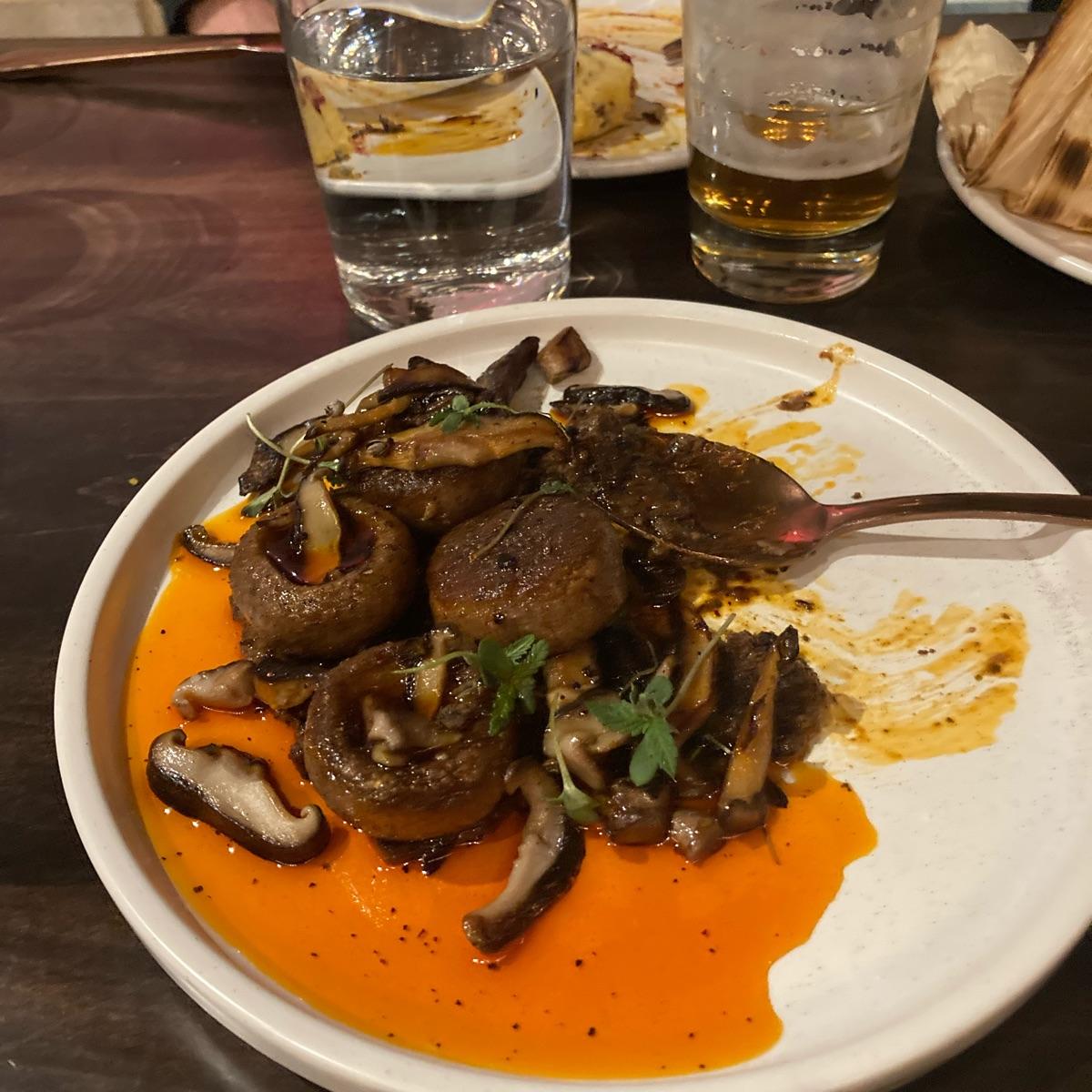 We couldn’t wait for the photo to tuck into this awesome entree. Owamni knows its way around mushrooms! These are spicy (look at the color of that oil) and come on a bed of dumplings and amaranth.