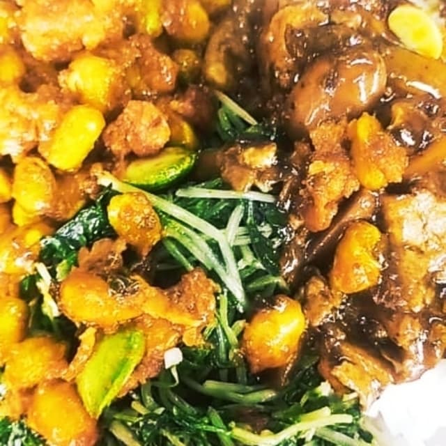 An abundance of exotic vegetable dishes that were far from ubiquitous. I selected some that looked interesting even though I didn't know what they were, and all were delicious. A little more expensive than the usual economy rice stalls, but a cut above.