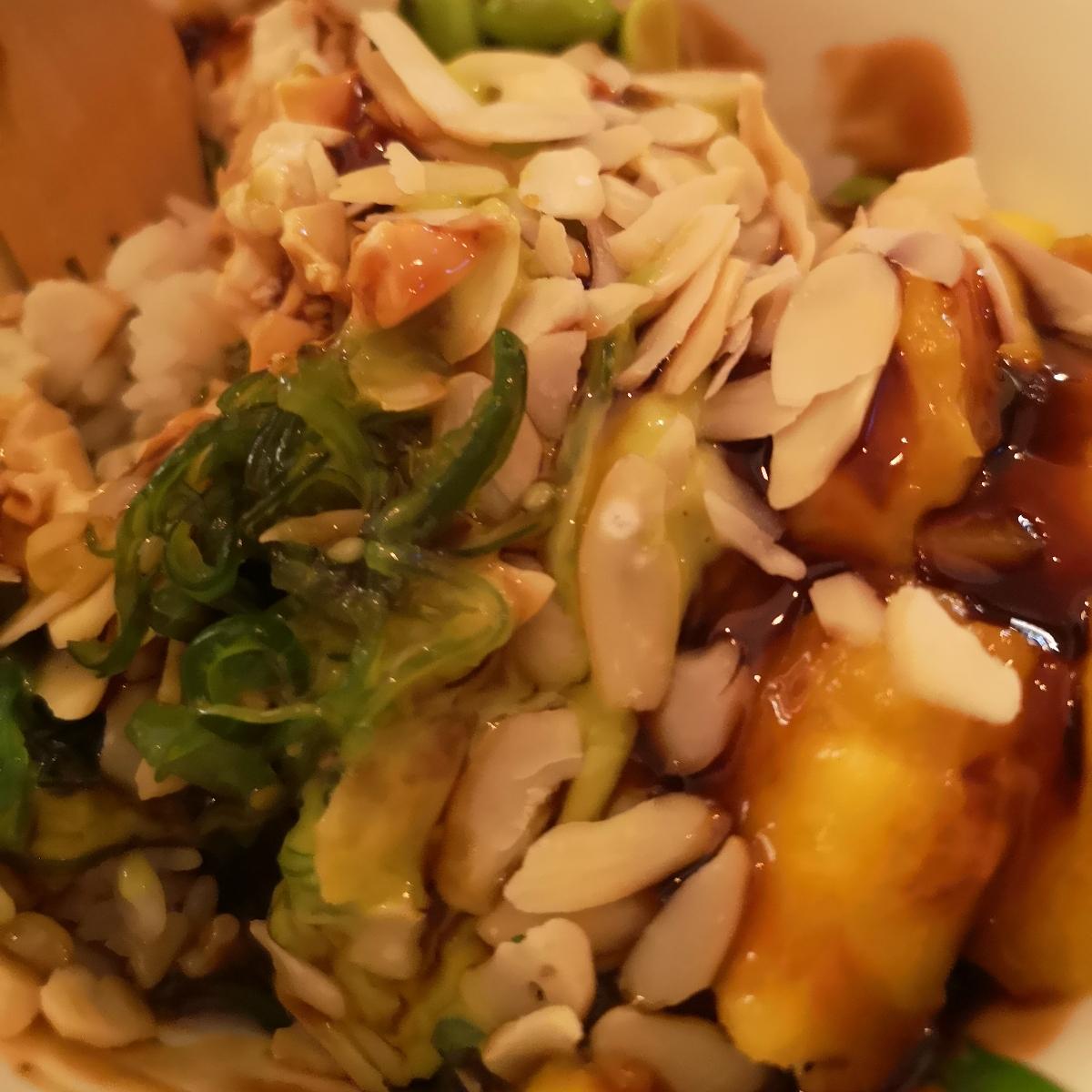 Poke vegan con riso sushi e riso venere, tofu, edamame, alghe wakame, avocado, mango e mandorle tostate con riduzione di salsa di soya. Consigliatissimo!
