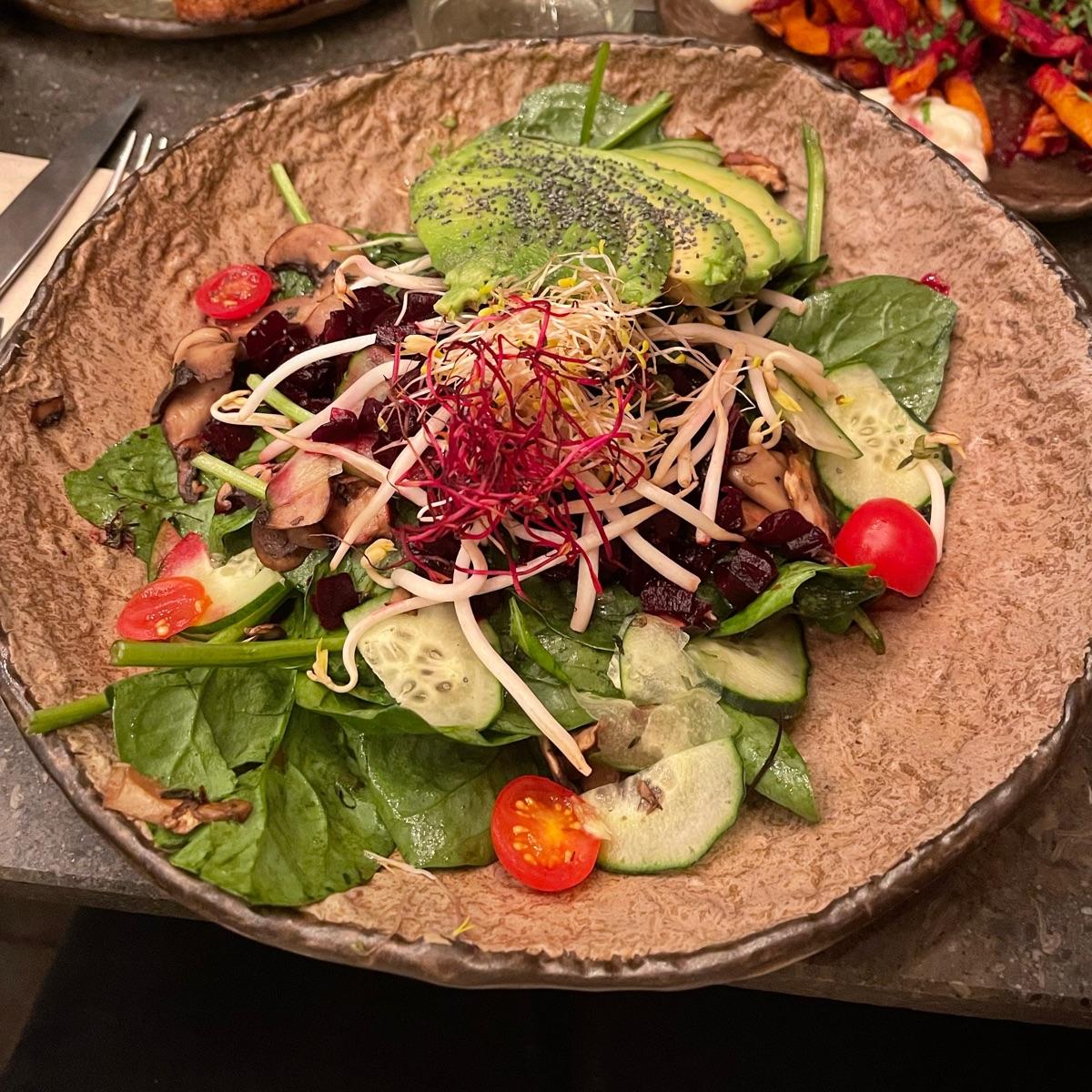 Ensalada muy completa! Parece pequeña pero acabé a rebentar😨 Llena mucho! Recomiendo el restaurante, tiene bastantes opciones PB y todo lo que he probado me ha gustado mucho✨