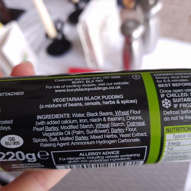 Never tried non vegan black pudding but this was tasted great. Decent nutritional value and inexpensive for how niche the product is. I'd say the texture is a little dry so it goes well with food that balances that. From the Vegan Kind online shop :)