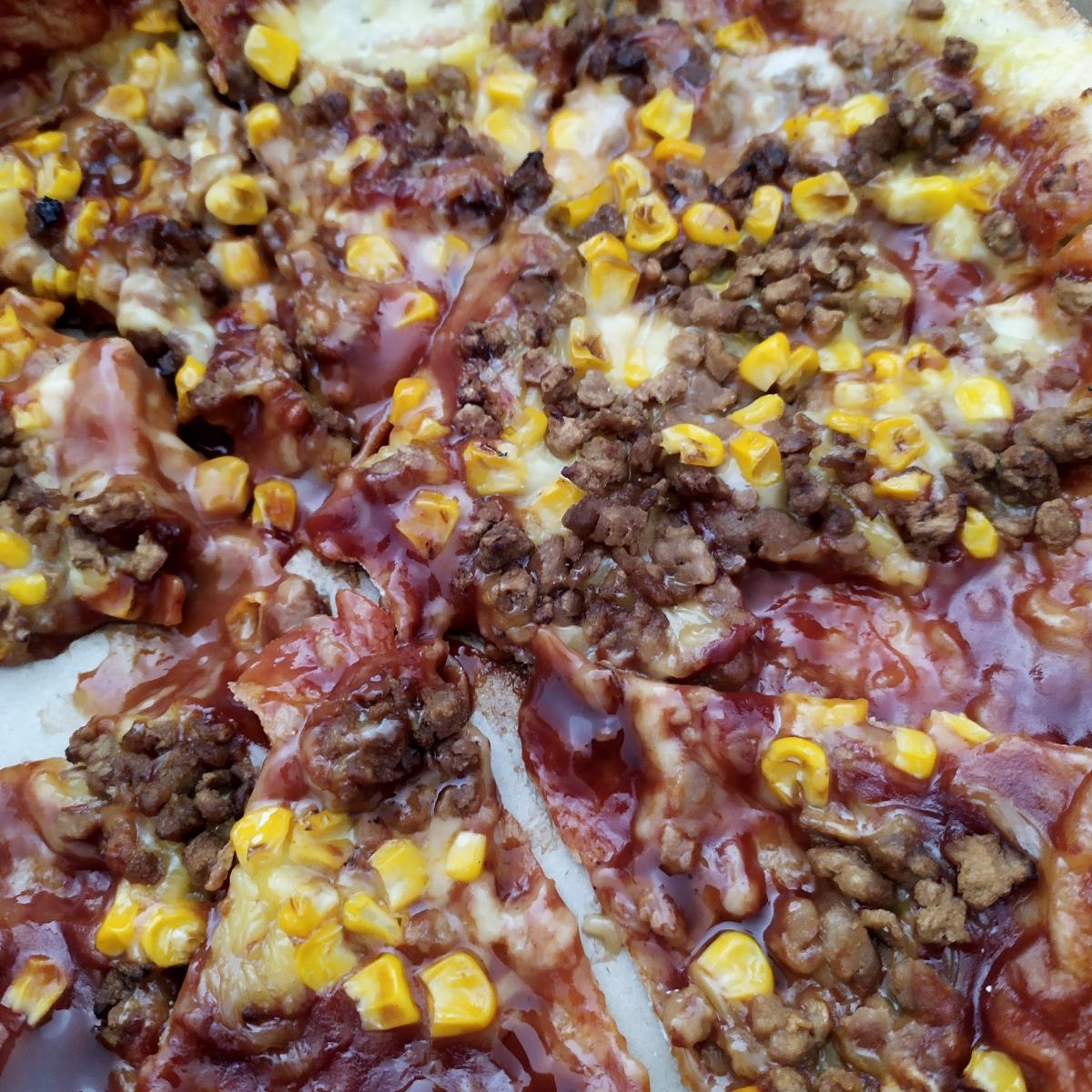 Pizza barbacoa, una de las tres opciones de las Veguis de Telepizza. La carne es la de Vegetarian Butcher y el queso de Violife. Está bien.