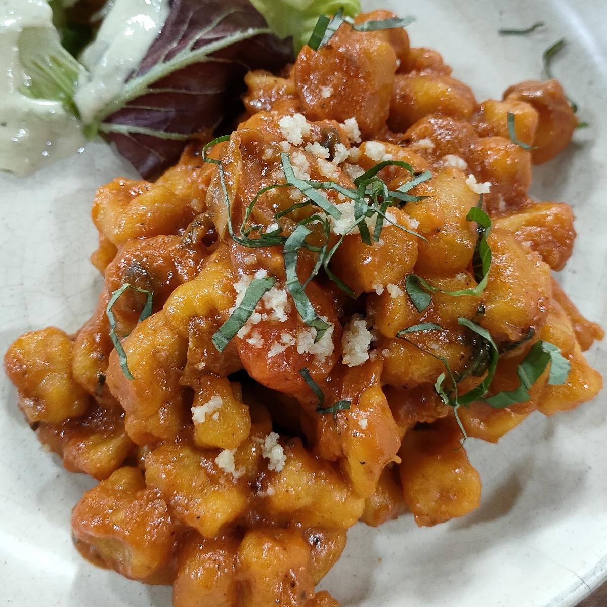 Pan fried taro Gnocchi in a creamy sauce with side salad. Creamy, delicious, filling. Will order this again!
