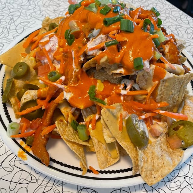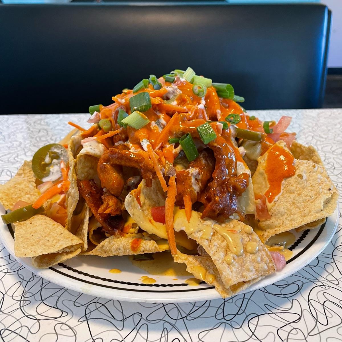 Spiral off into the land of savory, tantalizing and satisfying with a plate of these bomb nachos! They are so gushing with divine flavor. I love the perfectly seasoned Buffalo chikin strips, green onion, crispy chips, jalapeños and sauce drenched all over this masterpiece! Definitely a must have for a snack or something to share with someone, these mountain nachos are a true delight. :) #supportlocal