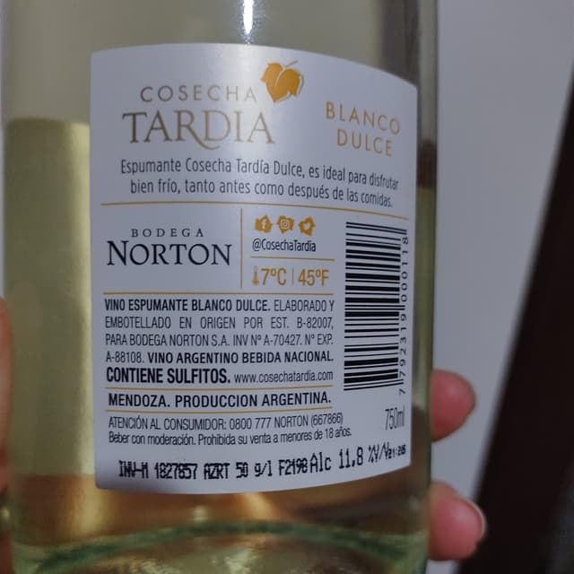 Vino blanco dulce Norton Cosecha tardía. Muy rico, aroma dulce y suave, sabor dulce tranquilo con notas ácidas al final.
