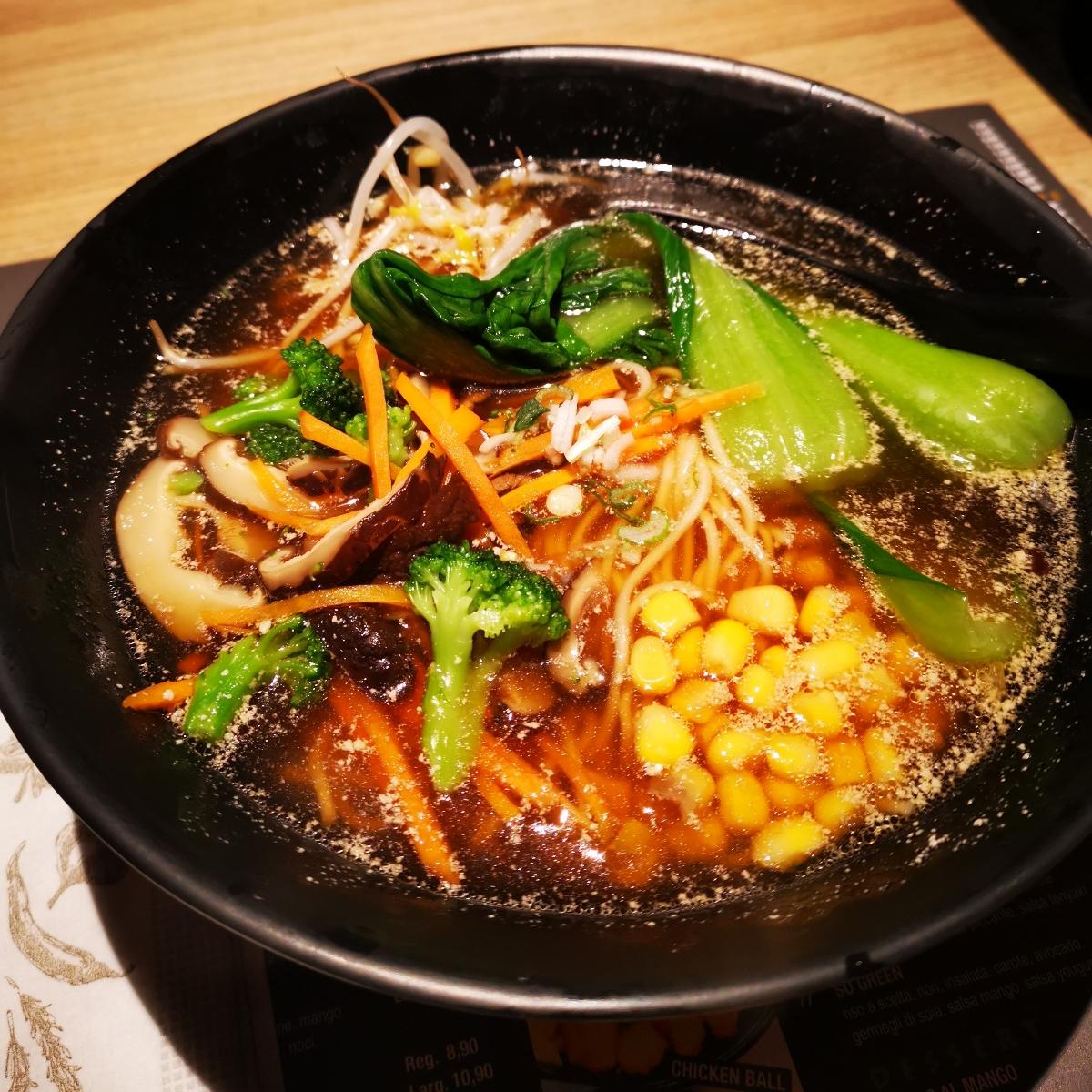 Incredibile.Ingredienti: brodo a base di alghe di konbu con broccoli, mais, pak choi, funghi di shitaki, germogli di soia, carote, cipollotti