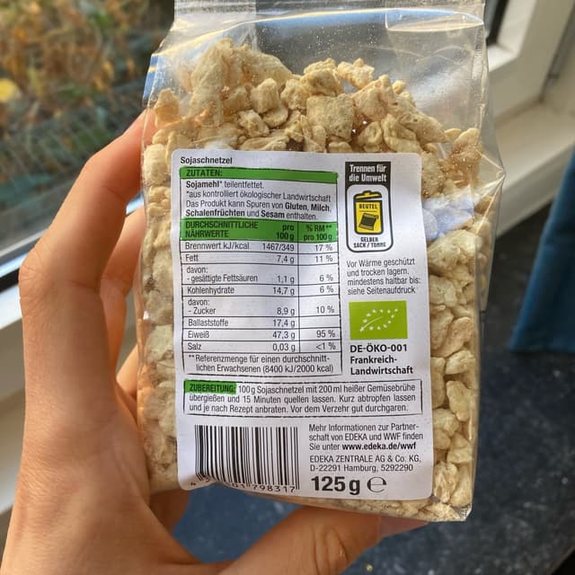 Dried soy chunks! These are an amazing source of protein. You can soak them in water to make a vegan meat replacements or add then dried to your oatmeal to provide a nice crunchy
