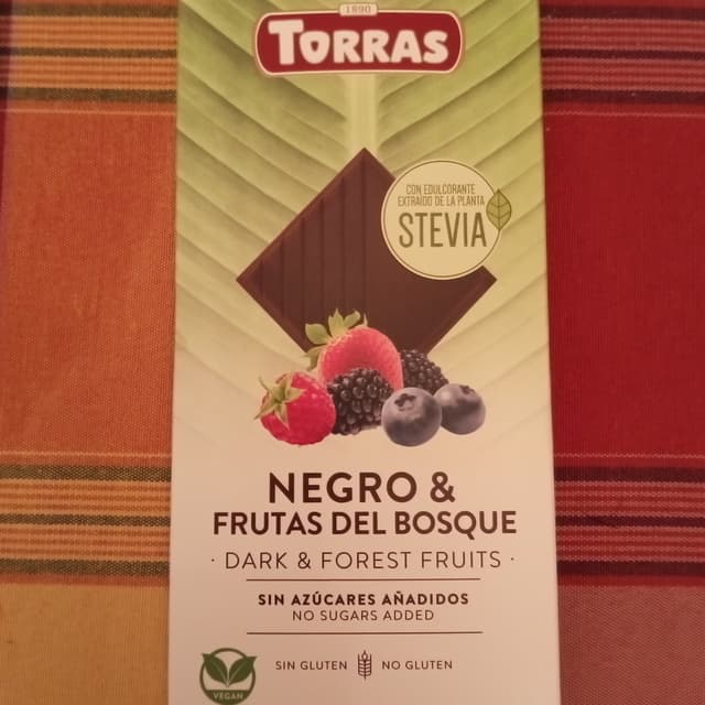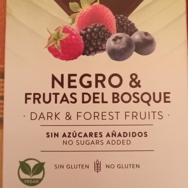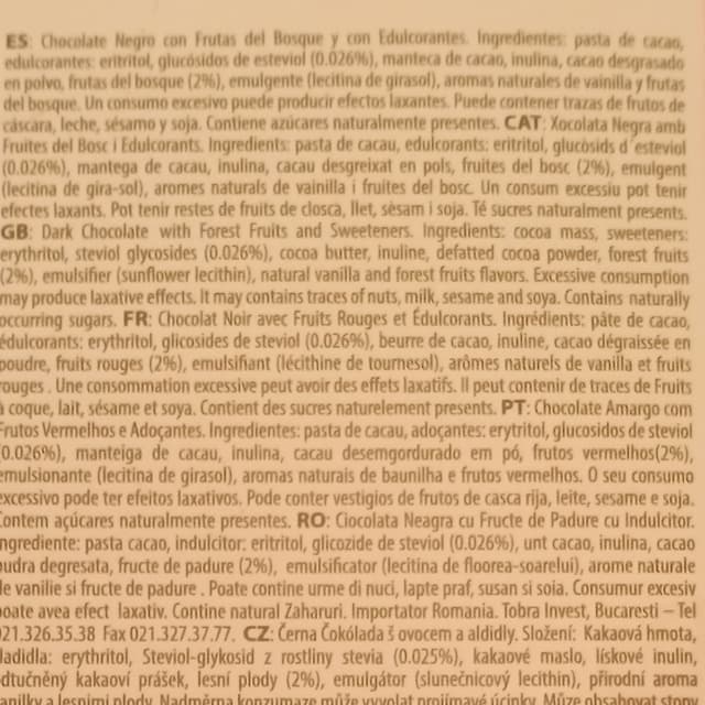 Tableta de chocolate negro con frutas del bosque, sin azúcares añadidos pero con edulcorantes. El envase indica stevia con letras gigantes pero solo lleva 0,026%, el edulcorante principal es eritritol. Y de frutas del bosque 2%. Tableta fina, está rica pero me quedo con otros chocolates.