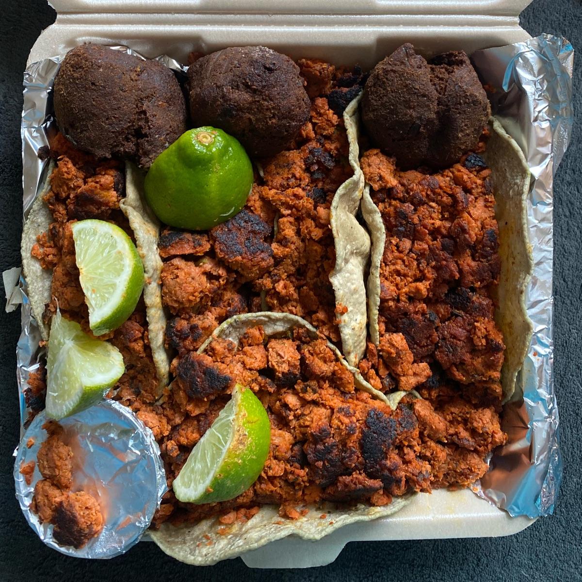 ¡Los tacos están enormes! Tenían mucha soya, queso y guacamole. También venían incluidas unas bolitas de falafel muy ricas.