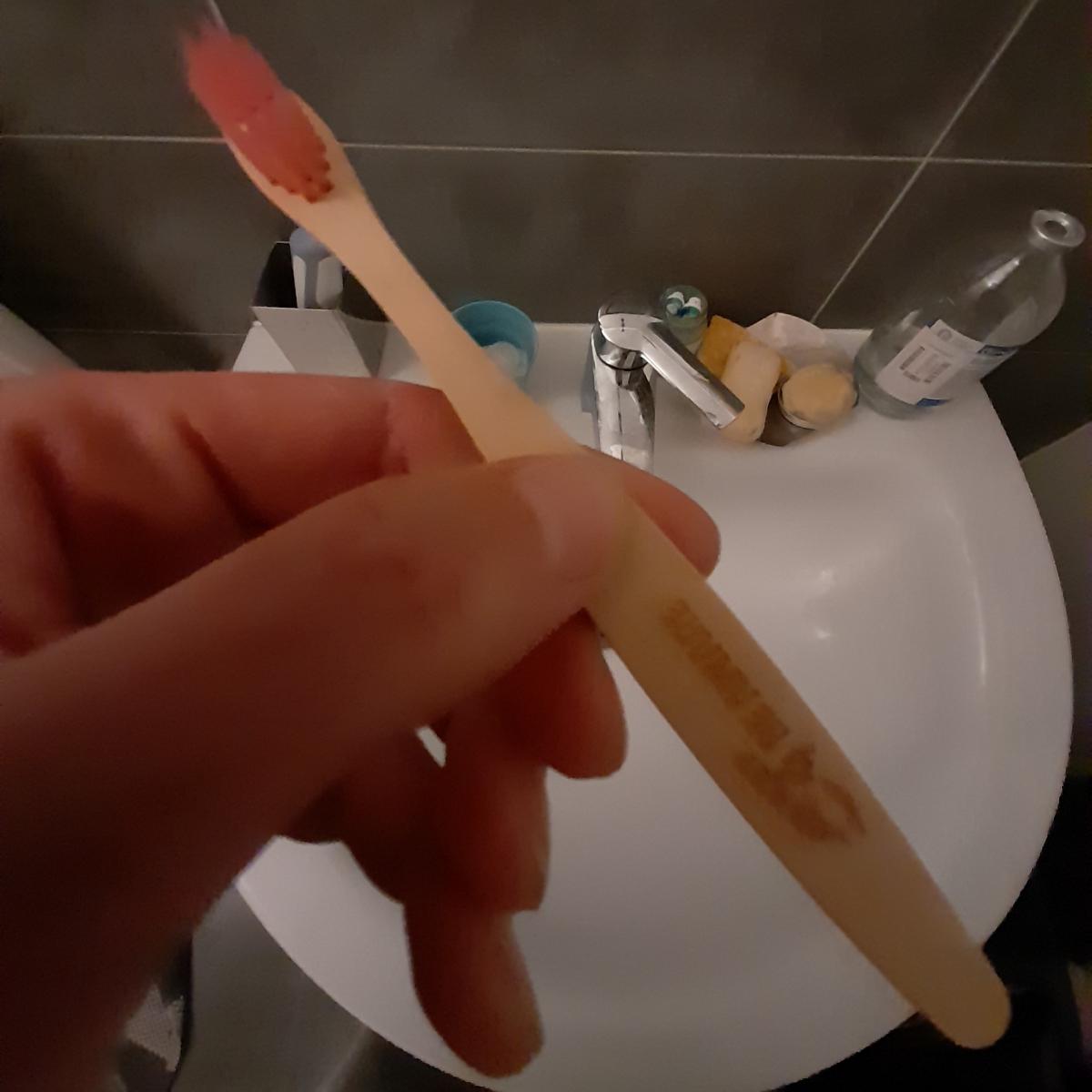 Wooden toothbrush, perfect size for children. Maybe bristles should be a little softer.