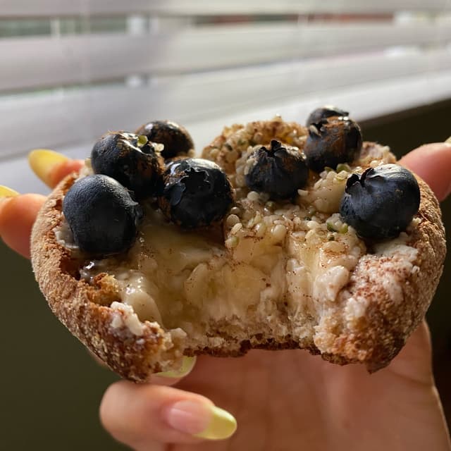 i had one two ways for breakfast with jam, almond butter, strawberries, cinnamon, and chia seeds. the other half i had with cashew cream cheese, banana, blueberries, cinnamon, hemp seeds, and a drizzle of agave.