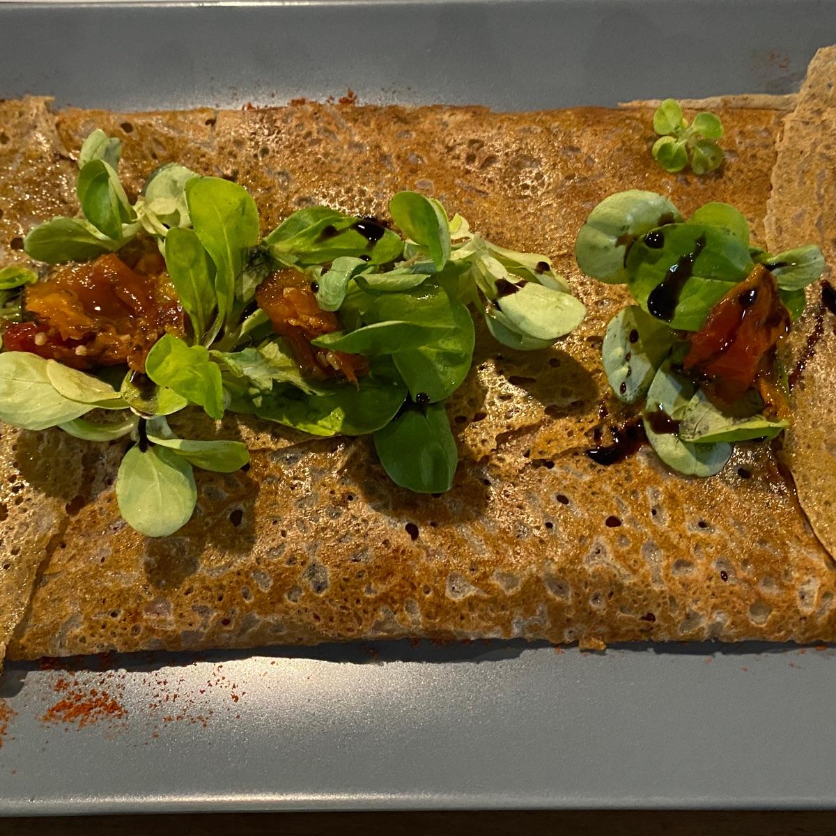 Very savory vegan crepe with sautéed mushrooms, sun dried tomatoes and peppers. Followed up with a vegan raspberry crepe for dessert. Sweet but not too much. This was a hack as the menu does not offer a vegan dessert crepe.