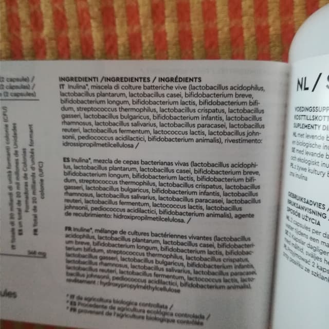 180 capsule (quindi scorta per 3 mesi, assumendone 2 al giorno) di inulina biologica e 21 ceppi di probiotici vegan.