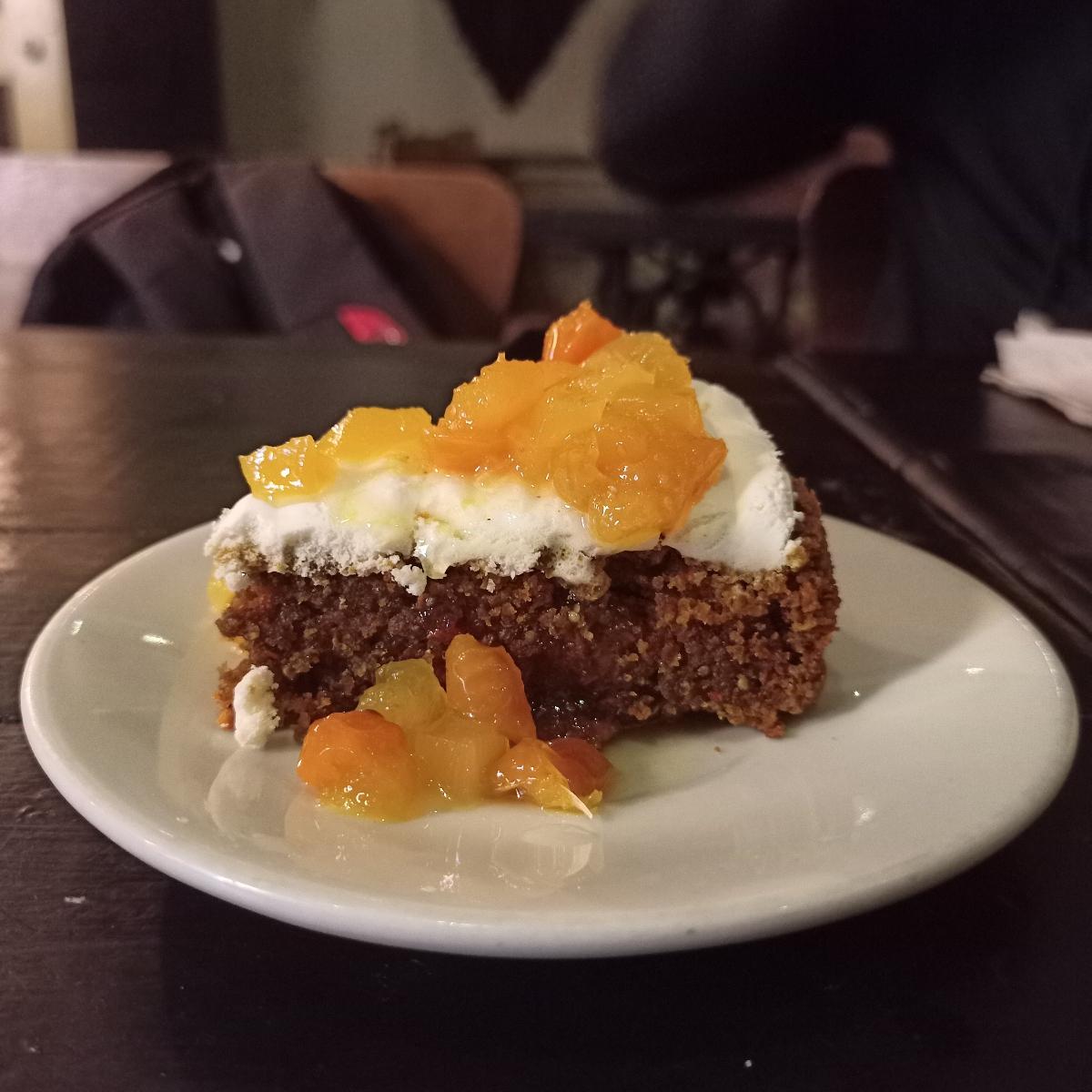 Deliciosa, tiene sabores peculiares y exquisitos. Sus ingredientes son estos: Torta de zanahoria rellena de froasting de vainilla bañada en salsa de uchuva y nueces.