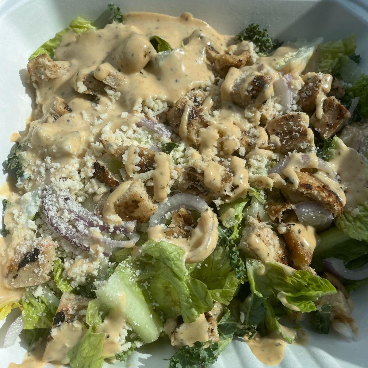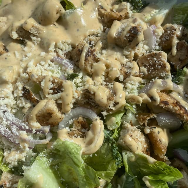 Creamy and heavenly genius flavor… delicious vegan Caesar salad! Ask for extra chikin and sauce! So delicious!! Ask for no croutons to make it gluten-free! Wow this is so incredible! Satisfying and texture is so good. 😊