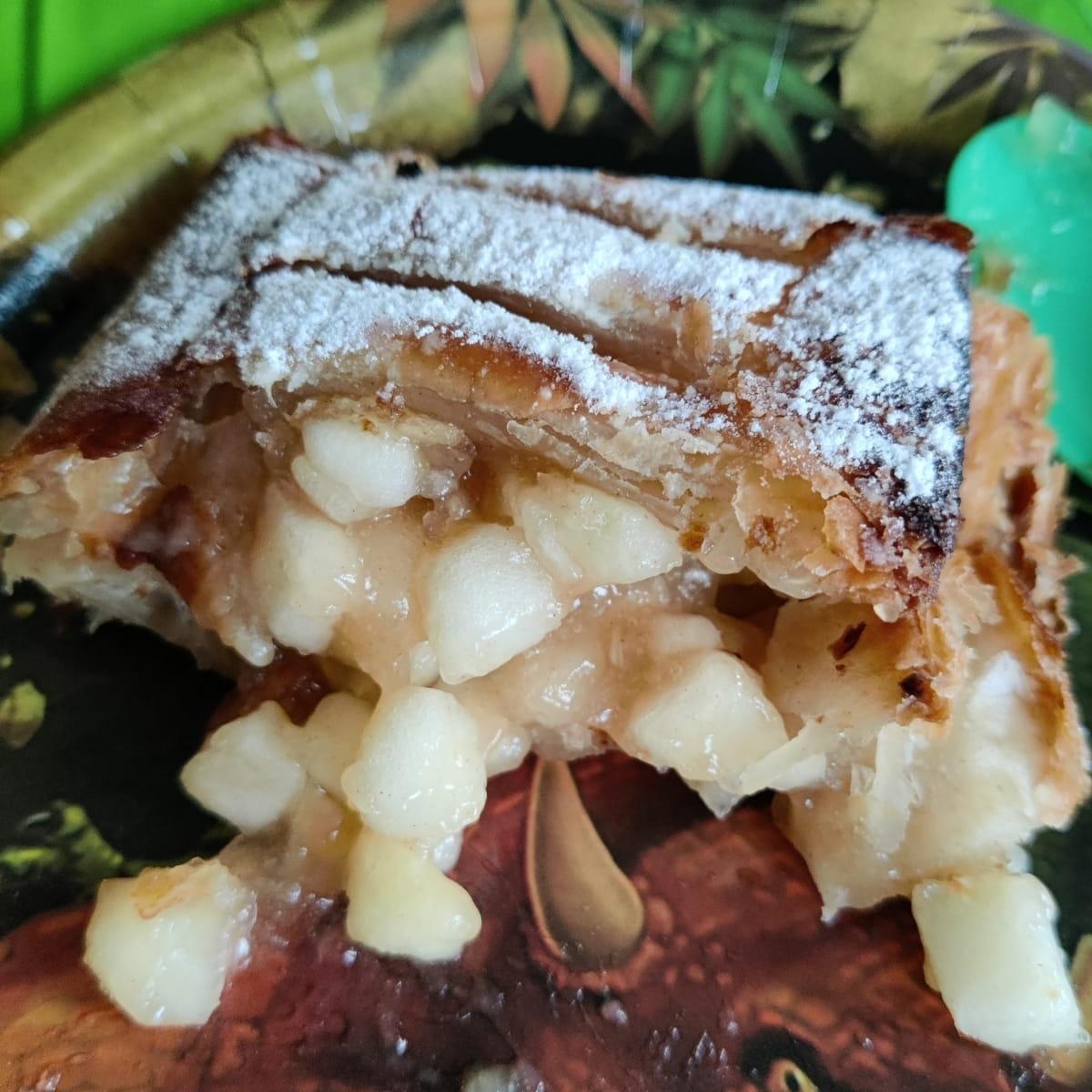 Sfoglia croccante e interno ricco di mele e marmellata.