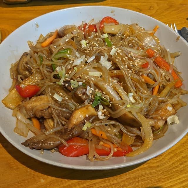 Tasty dish made of glass noodles ("spaghetti di soia") veggies (onions, garlic, peppers, carrots) and few different kinds of mushrooms. Yummy!