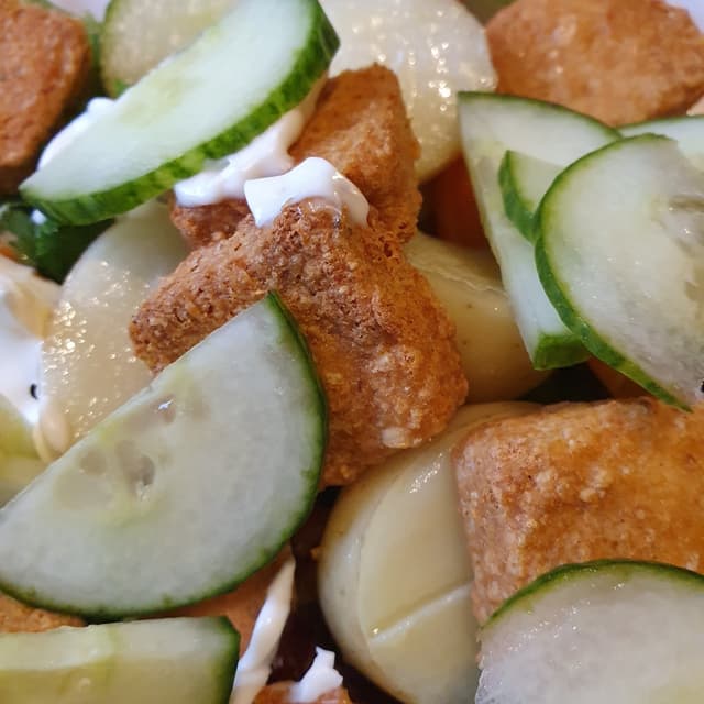 Really tasty tofu bits with a spicy kick! Easy addition to any salad :) texture wasn't as crisp as I imagined but still very nice!