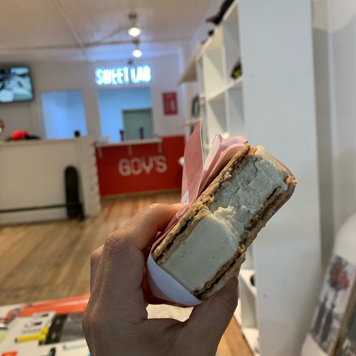 Delicioso sándwich helado con galleta de Waffle y caramelo.