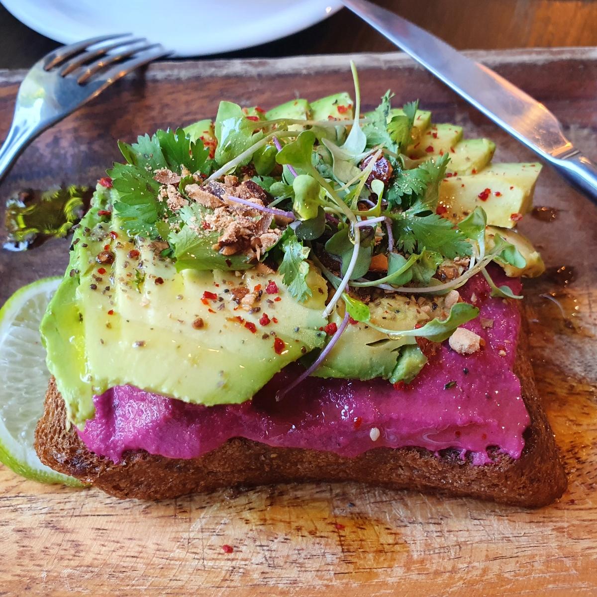 Avocado-Toast mit Rote-Bete-Hummus.Sehr lecker, es gibt nichts zu beanstanden.