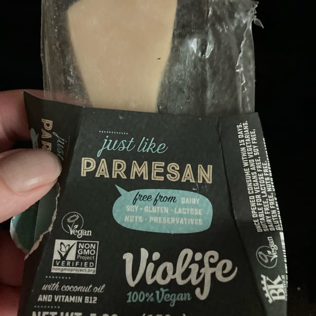 I was thrilled to find this Parmesan wedge. Like most Violife products I really like the taste. What particularly appeals to me though is that it can be grated or sliced/shaved to put on dishes just like a real Parmesan wedge.