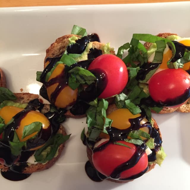 This refreshing appetizer hits the spot. Bruschetta with avocado, Miyoko’s mozz, heirloom grape tomatoes, basil and a balsamic glaze drizzle. Caprese bruschetta, but up your game.