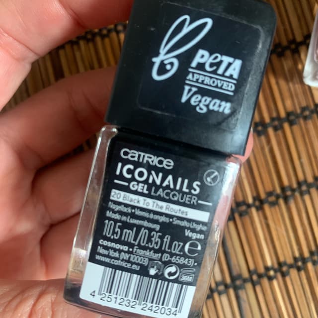 nero classico opaco, da rendere lucido col top coat. Tenuta 2/3 gg. Si stende bene.