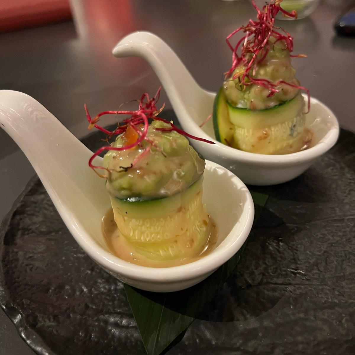 Gunkan veg avvolti da una zucchina con dentro qualcosa di buonissimo che non ricordo e guarnito sopra con dei fili di barbabietola. Squisito !