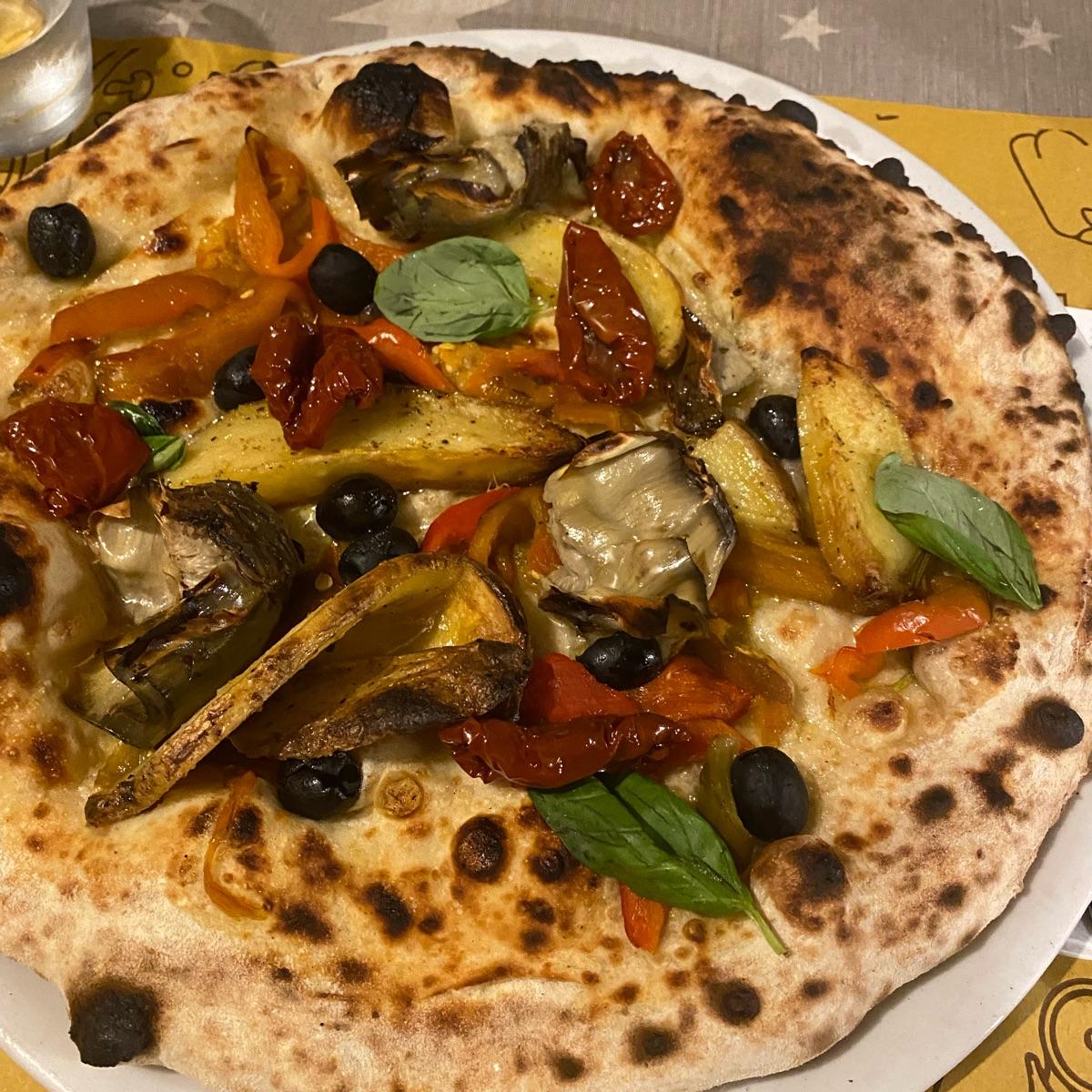 Buonissima pizza, molto bilanciata. Chiamata vegetariana ma vegana, base focaccia con pomodorini secchi, patate al forno, carciofi e peperoni arrosto, olive nere e basilico. La prendo ogni volta che vado, una garanzia!