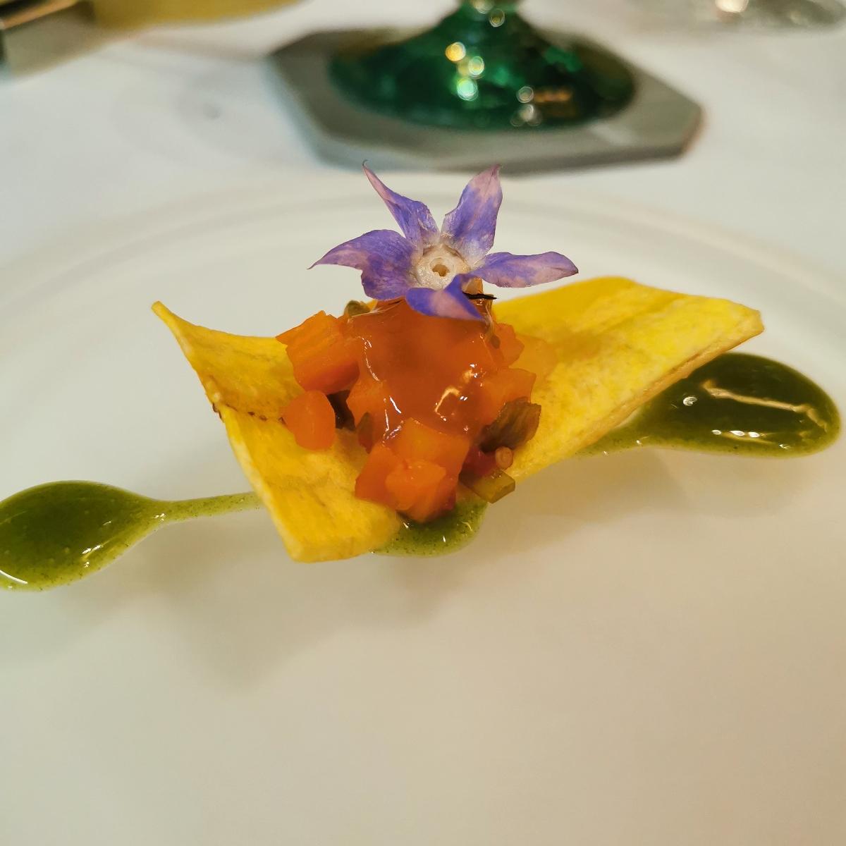 Entrée vegano propostomi, chips di platano fritto con una tartare di pomodoro e una salsa al basilico, buono, sapore delicato, ottime consistenze.
