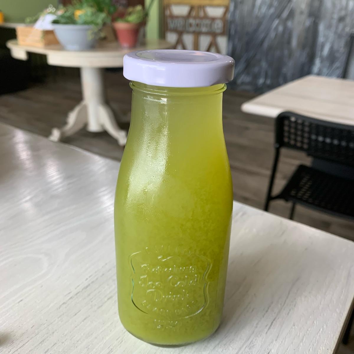Light and refreshing Contains ginger, lemon, apple, spinach and cucumber. Comes in this adorable, reusable glass jar. I’m not sure if they’re fresh juiced or pre-bottled. This all plant based restaurant just opened in Elk River, MN. Love the atmosphere and all of the plants. Odd that the same owners also own the Tipsy Chicken restaurant right next door but so glad they expanded into plant based.
