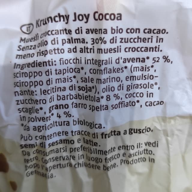 Cereali croccanti per la colazione con avena cacao e cocco. Molto buoni, sia nel latte vegetale, che nello yogurt