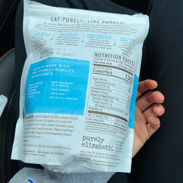 i would definitely buy these again. it’s sweetened with coconut sugar and baked with out any seed oils but instead coconut oil. there’s chocolate chunks in every bite 🤤🤤 all, certified fair trade dark chocolate✔️ purely elizabeth uses the best ingredients