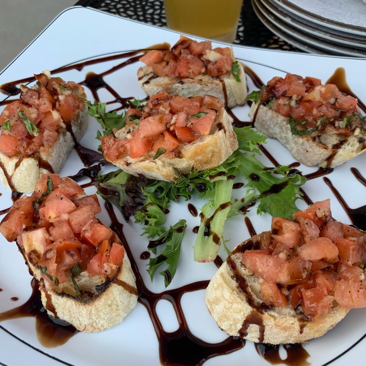 Fresh bread with tomatoes, greens and balsamic. Easy to order without cheese! Confirmed bread is vegan. Divine! 😋 #uplandspeak