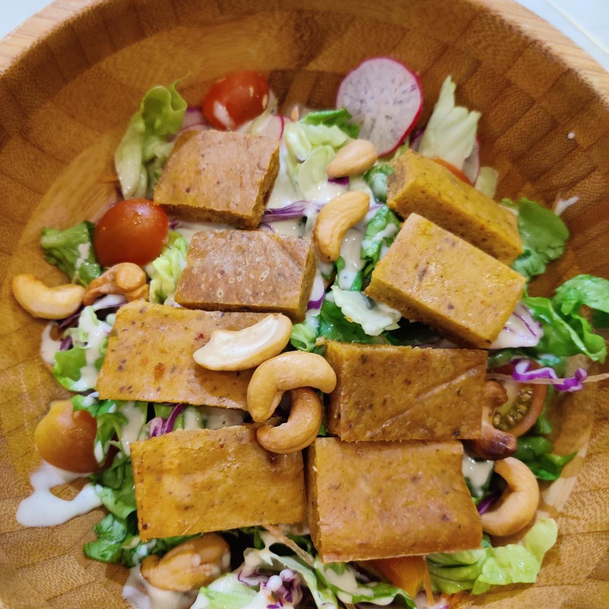 Loved the nyonya otah chunks! Very substantial; not stingy at all. The veggies in the bowl was kind of salad. The usual lettuce, thin carrot sticks and some thinly sliced red cabbage. Had roasted cashew nuts for some nice crunch and a vegan creamy sauce. Overall nice and light dish that's still flavourful.