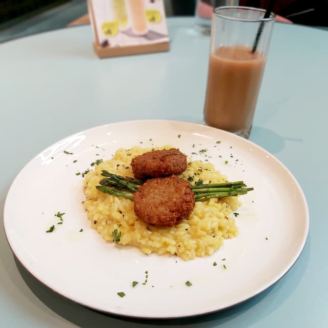 A nice drink. I'm down to try milk tea as it isn't that common to find vegan ones. It was pretty how the milk and tea were separate layers. The milk layer was very sweet and became not so sweet when mixed. Quite nice and comforting and this helped me wash down the risotto, which was a bit below expectations. On the pricey side at $6++. I think $5 would be reasonable. Now that know what this tea is like, I can probably make something similar at home if I find the right tea.