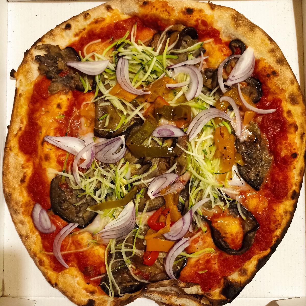 Pizza ortolana con mozzarella vegetale, peperoni, zucchine e melanzane a cui ho fatto aggiungere cipolla e la base di pomodoro. Impasto buono e digeribile, condimento saporito e ben bilanciato. Non sono una grande fan della mozzarella vegetale, ma insieme a tutto il resto stava davvero bene regalando un'ottima cremosità.