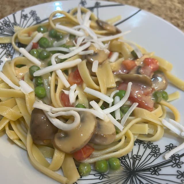 This is the first plant-based mozzarella that I have really enjoyed. I used it on homemade pizza the other day and it was great! Here's a dash sprinkled over pasta with a vegan Alfredo based sauce.