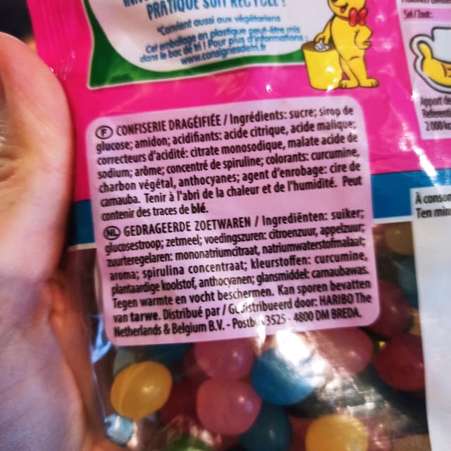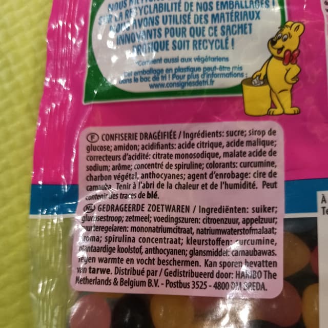 (F) CONFISERIE DRAGÉIFIÉE / Ingrédients: sucre; sirop de glucose; amidon; acidifiants: acide citrique, acide malique; correcteurs d'acidité: citrate monosodique, malate acide de sodium; arôme; concentré de spiruline; colorants: curcumine, charbon végétal, anthocyanes; agent d'enrobage: cire de carnauba. Tenir à l'abri de la chaleur et de l'humidité. Peut contenir des traces de BLE.