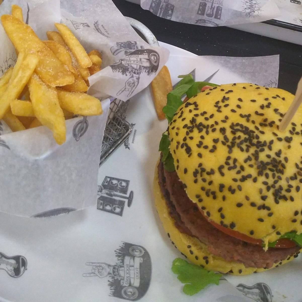 Viene con tomate y rúcula, y papas fritas. Además trae un Dip. Están en el Shopping de San Justo. Desde que están se terminaron las cajitas felices para mí hijo. Tiene Menú infantil con regalo (no vegano)
