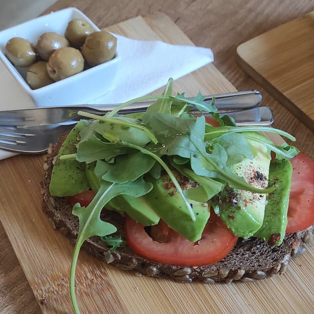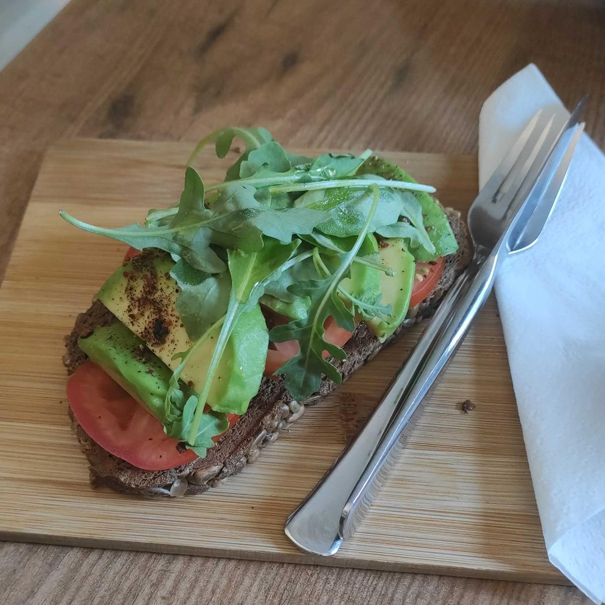 Toast aperto con pane di segale, avocado, pomodori a fette, rucola, spezie tra cui il peperoncino, molto buono se doveste passare da questo bar consiglio di prenderlo e provarlo!