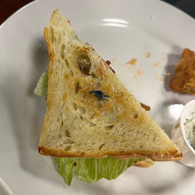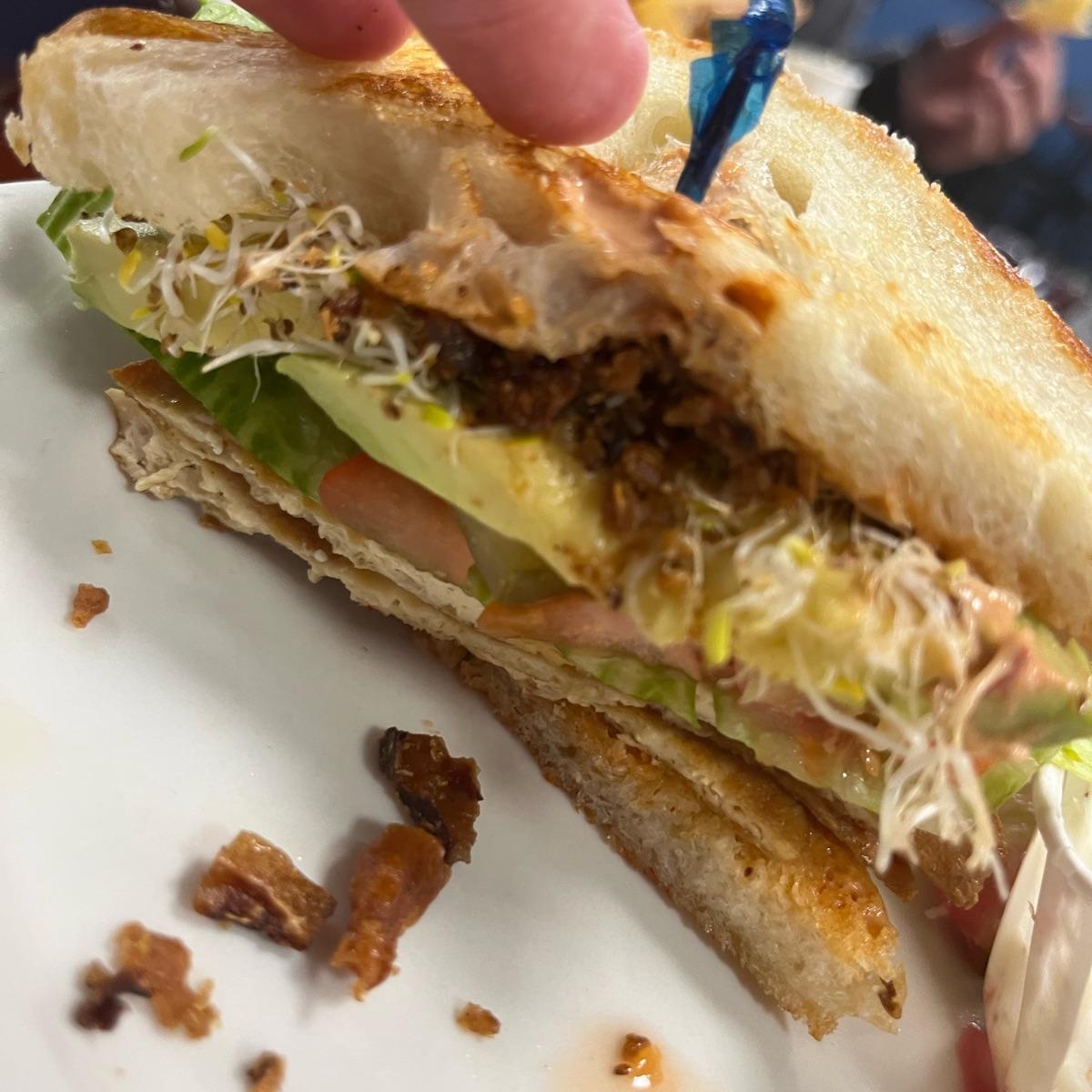 Tasty sourdough bread, marinated tofu, mushroom bacon, avocado and a spicy aioli! Was very good! Its a warm sandwich- i split it with my sister
