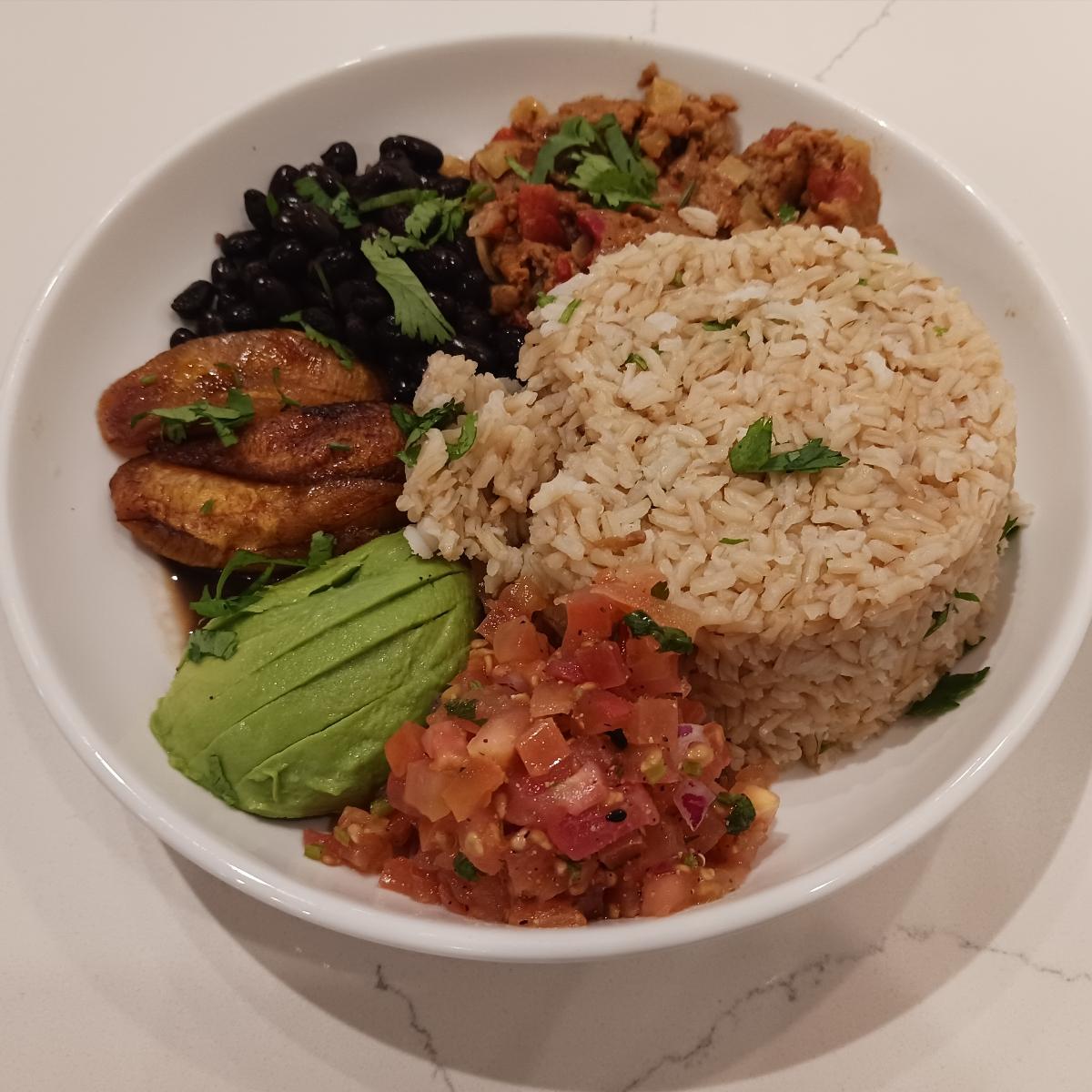 This bowl consists of healthy grain, avocado, Pico de Gallo, black beans, plantains and vegan protein. I would have traded some grains for more black beans. #veganprotein