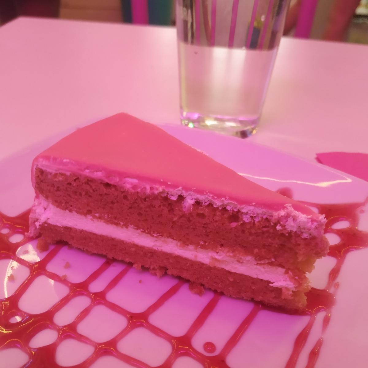 Muy rica. Bien equilibrada entre bizcocho y crema (nata). Cubierta de chocolate blanco.