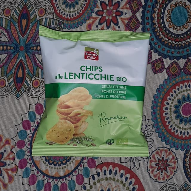 Chips fritte alle lenticchie, acquistate come spuntino fuori casa. Sono molto croccanti e il sapore è buono, anche se si sentono molto l'aglio e la cipolla. Acquistate da NaturaSì.