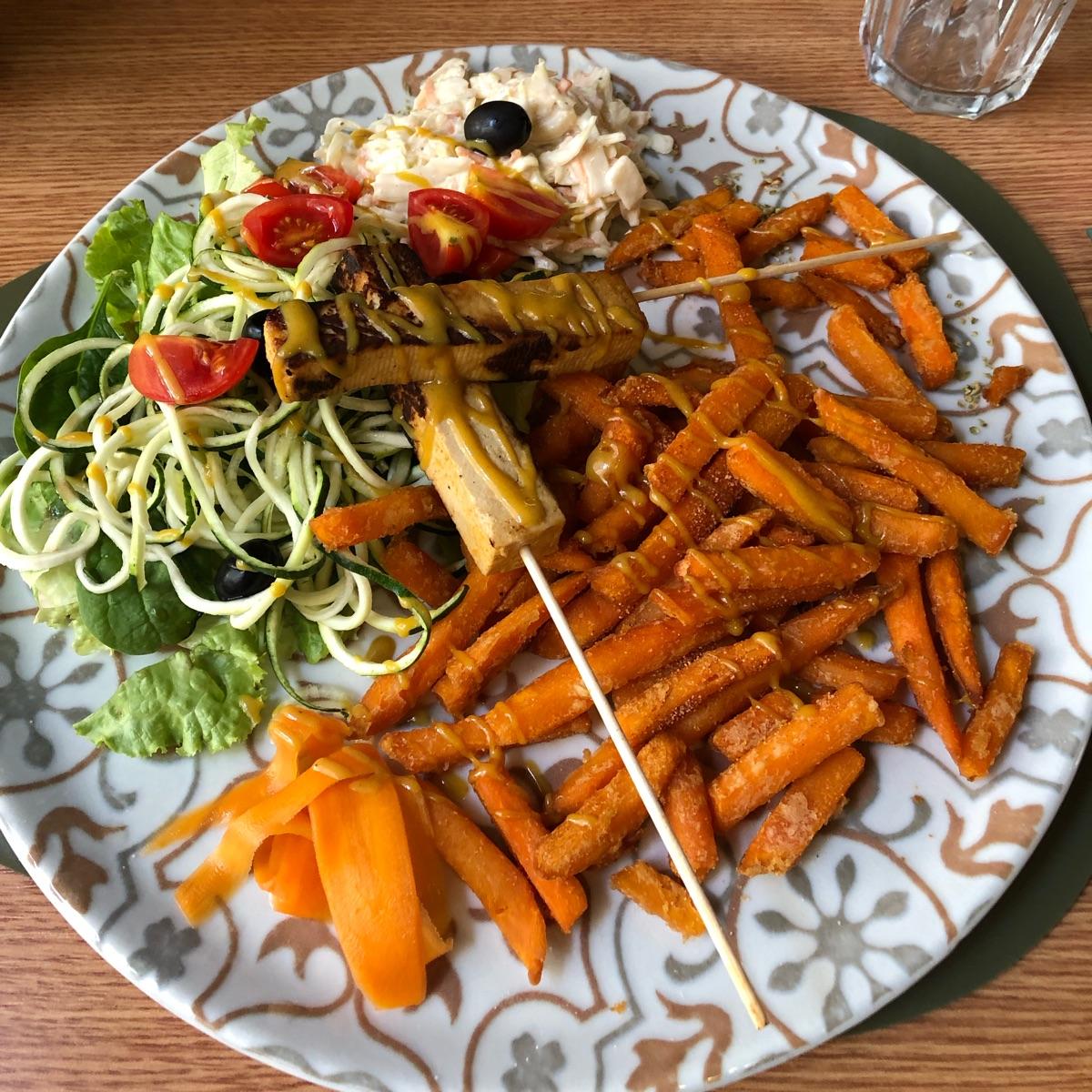 Nel piatto tofu grigliato con mostarda dolce, patate dolci, carote marinate, olive, coleslaw, pomodorini, zucchine e noci. Molto leggero e delizioso, siamo tornati nel ristorante per provare altri piatti