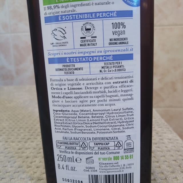 Comprato al Tigotà. Ha un buon odore di fresco e di pulito. C'è scritto che è per capelli grassi, comunque io lo uso pur avendoli secchi e non lo trovo aggressivo. Flacone in plastica riciclata.