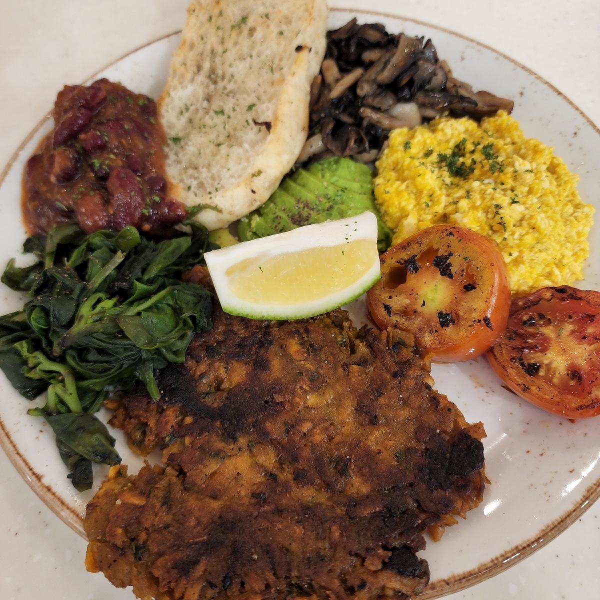 It is loaded with scrambled tofu, mushrooms, tomatoes, and beans.