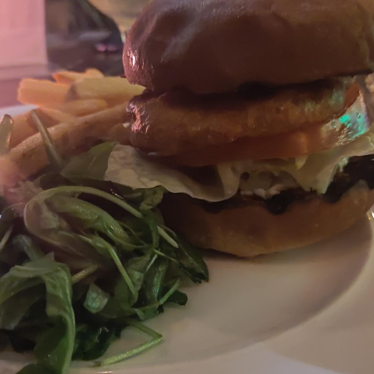 Hamburguesa que imita al famoso fish and chips con un filete de tofu rebozado, una versión de un clásico muy recomendable.